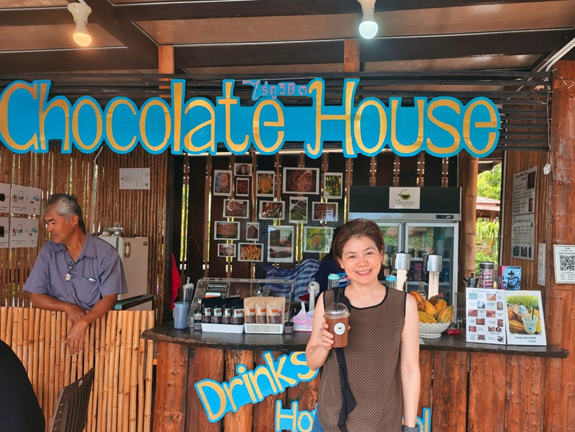 คุณลุงบอกว่า ปลูกโกโก้ไม่ยาก เท่าการทำช็อกโกแลตให้ได้คุณภาพสม่ำเสมอ เขาทำช็อกโกแลตเป็นเกรดพรีเมี่ยมไร้ไขมันทรานส์ และเน้นเอามาแปรรูปเป็นเครื่องดื่ม เบเกอรี่ ไอศรีม ฯลฯ เพิ่มมูลค่าเพิ่ม